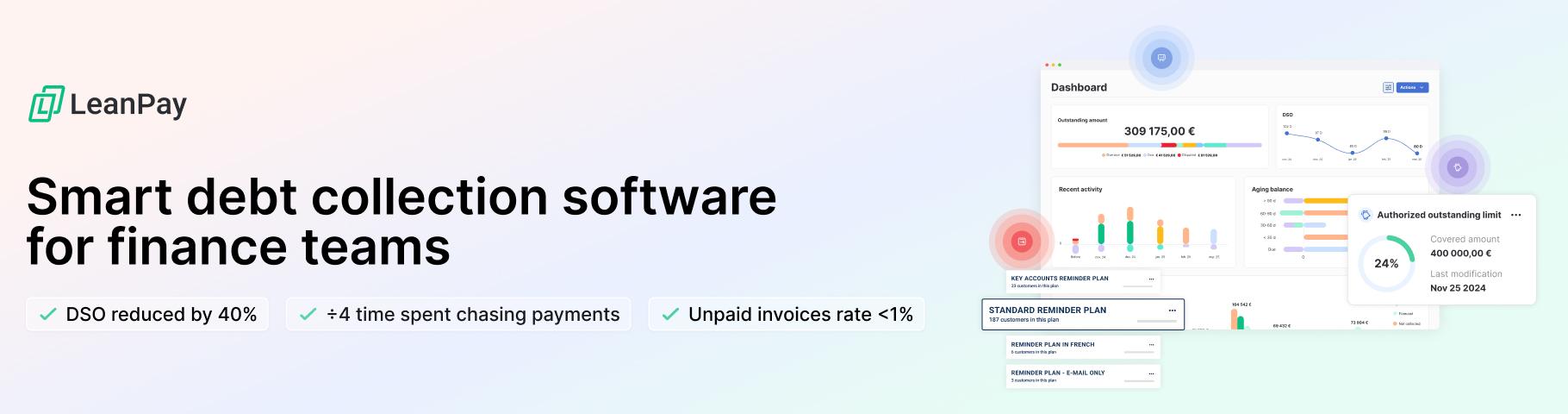 LeanPay is an accounts receivable and debt collection software designed for finance teams of SMBs, mid-sized companies and groups. With LeanPay: