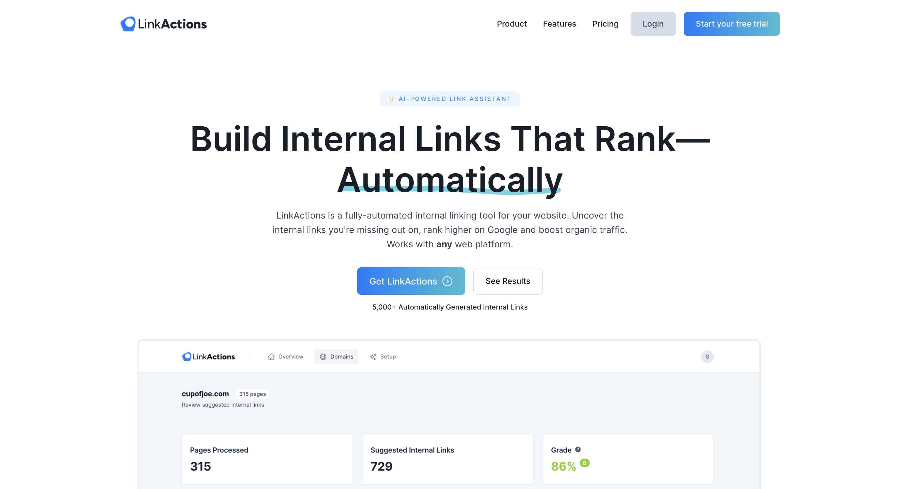 Maximize your website's SEO potential with LinkActions, the advanced internal linking tool designed for diverse web platforms. Unlike platform-specific tools, LinkActions is compatible with Webflow, Shopify, Ghost, Squarespace, Wix, Joomla, and more, offering a comprehensive solution for enhancing your site's Google ranking and organic traffic. Discover the ease of automating and optimizing your internal links with LinkActions' unique features.