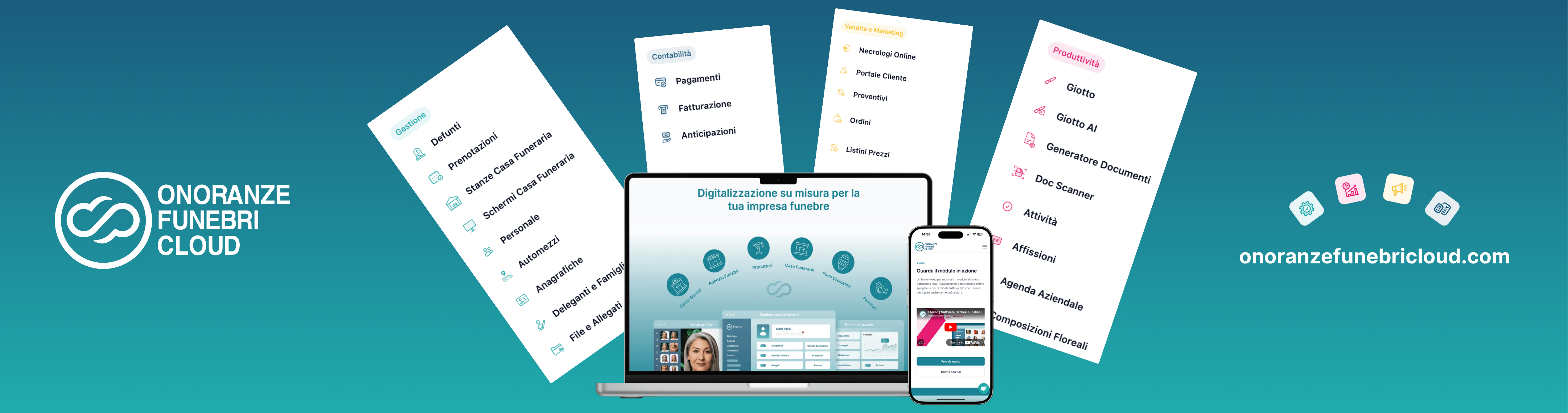 Eterno is the modular cloud platform by Onoranzefunebricloud, designed to digitalise and coordinate the processes of companies operating in the funeral industry. With over 40 configurable modules, Eterno adapts to the size, structure and services of each organisation and is built for a complete ecosystem that includes funeral agencies, funeral homes, service centres, suppliers and manufacturers, and crematoriums.