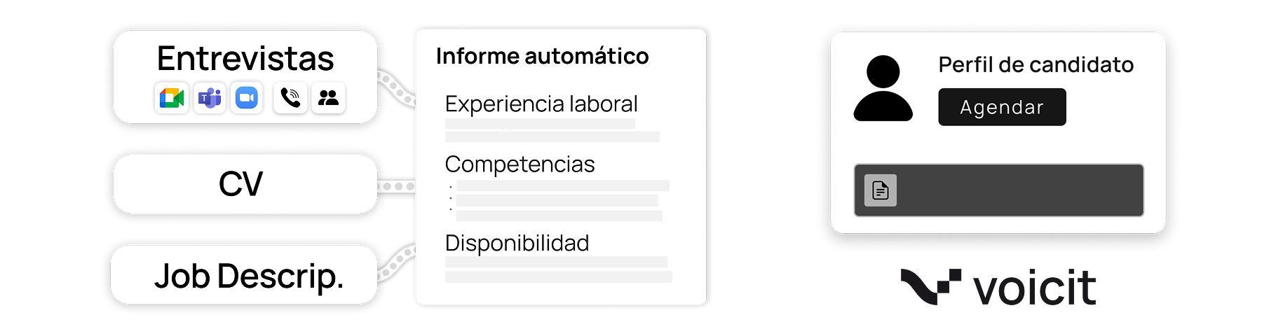 Voicit is the solution for automating and optimizing recruitment processes using artificial intelligence. Our platform allows you to automatically record, transcribe, and analyze interviews, generating comprehensive reports on candidates' skills, motivations, and expectations, so that HR teams can make more accurate and efficient decisions. This solution analyzes documents such as CVs, job descriptions, tests, notes, and more to generate the final candidate report.