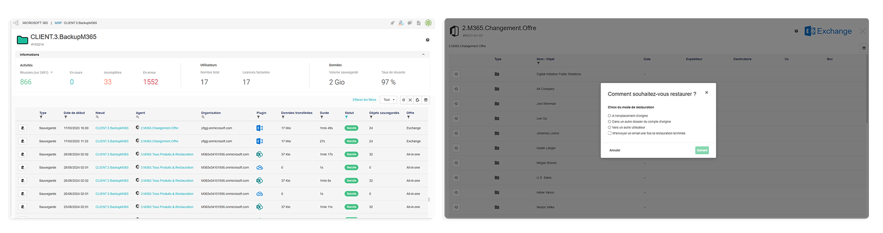 RG Backup Microsoft 365 is a 100% French Microsoft 365 data backup and recovery solution, designed for MSPs, CIOs and office workers. Integrated into the RG System Suite, it enables you to effectively protect your customers' mailboxes, files, collaborative spaces and critical data in Microsoft 365, while guaranteeing their sovereignty.