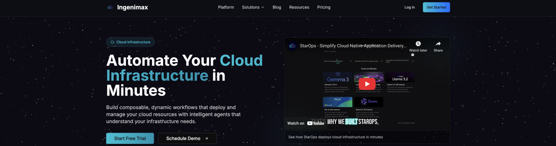 StarOps, developed by Ingenimax, transforms the way cloud infrastructure is automated for enterprises by simplifying the management of cloud resources across multiple providers. With intelligent agents and dynamic workflows, StarOps allows teams to deploy, configure, and manage cloud infrastructure in minutes, while ensuring security, compliance, and cost optimization. Additionally, the platform is vendor-agnostic, offering seamless integration with AWS, GCP, Azure, and other cloud providers.
