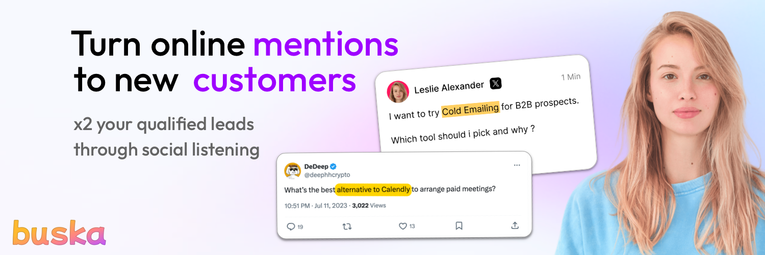 Buska helps businesses double their qualified leads by converting social media mentions into potential customers. Through real-time social listening, Buska ensures you never miss an opportunity to engage with prospects at the right moment.